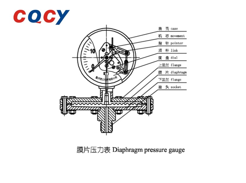 يعتمد جزء الغلاف هيكل إغلاق أمامي آمن ومحكم، ويأخذ جزء القياس صندوق الغشاء الدائري كعنصر حساس مرن، مملوء بزيت تخميد منخفض اللزوجة، بحيث تتمتع آلية القياس بالقدرة على مقاومة اهتزازات بيئة العمل أو نبض ضغط الوسيط. يمكن تقسيم فاصل الحجاب الحاجز إلى نوع ذي حواف، ونوع ملولب، ونوع مشبك، ونوع صامولة وفقًا لطريقة توصيله.